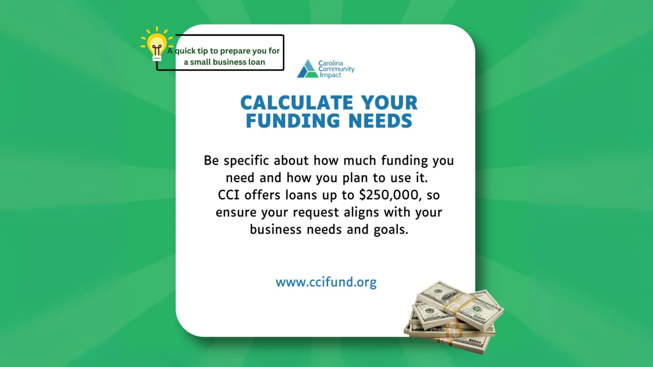 Knowing exactly how much funding you need will not only help you choose the right loan product but also demonstrate to CCI that you’ve done your homework and have a clear plan for the future. Stay specific and realistic with your request to increase your chances of success.