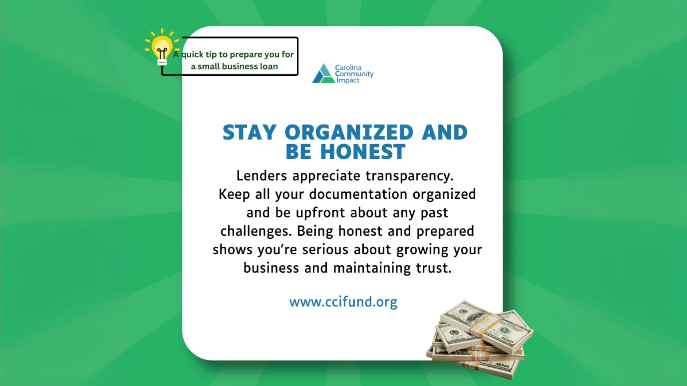 Lenders value transparency and honesty in the loan application process. Keeping all of your documentation organized and being upfront about your business’s challenges will help build trust with CCI and increase your chances of securing a loan.